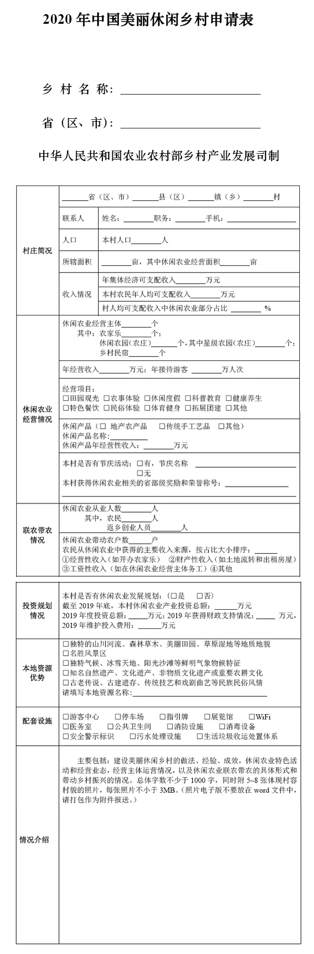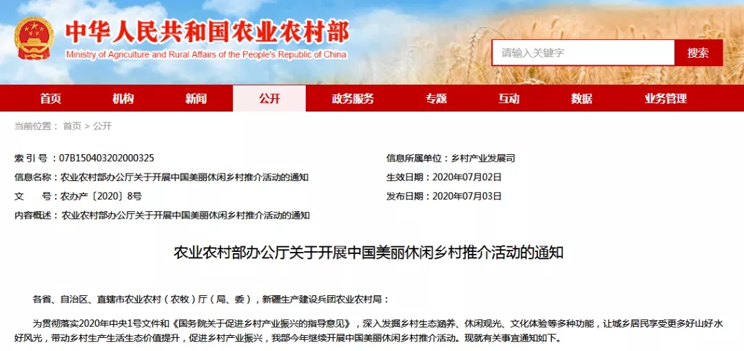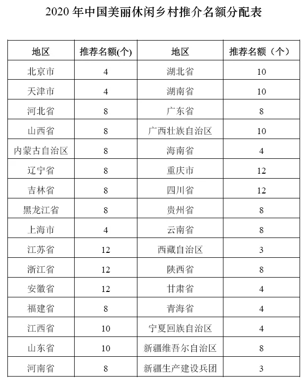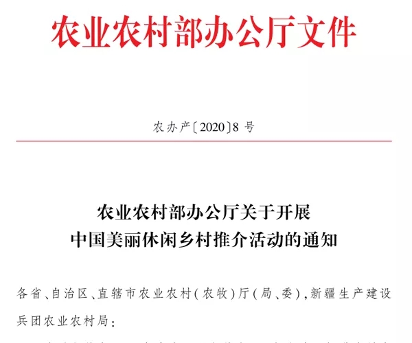 农业农村部办公厅开始中国美丽休闲乡村推介活动 中国记录新闻网 2032文章 2评论 2020-07-1408:29:58樂活中國评论34,892字数 1796阅读5分59秒阅读模式 中国记录通讯社据农业农村部消息:为贯彻落实2020年中央1号文件和《国务院关于促进乡村产业振兴的指导意见》,深入发掘乡村生态涵养、休闲观光、文化体验等多种功能,让城乡居民享受更多好山好水好风光,带动乡村生产生活生态价值提升,促进乡村产业振兴,今年将继续开展中国美丽休闲乡村推介活动。具体信息如下。 农业农村部办公厅 关于开展中国美丽休闲乡村推介活动的通知 各省、自治区、直辖市农业农村(农牧)厅(局、委),新疆生产建设兵团农业农村局: 为贯彻落实2020年中央1号文件和《国务院关于促进乡村产业振兴的指导意见》,深入发掘乡村生态涵养、休闲观光、文化体验等多种功能,让城乡居民享受更多好山好水好风光,带动乡村生产生活生态价值提升,促进乡村产业振兴,我部今年继续开展中国美丽休闲乡村推介活动。现就有关事宜通知如下。 一、推介条件 中国美丽休闲乡村以行政村为主体单位,依托种养业、田园风光、绿水青山、村落建筑、乡土文化、民俗风情和人居环境等优势,发掘新功能新价值、培育新产业新业态,功能特色突出,文化内涵丰富,利益联结机制紧密,改造提升乡村休闲旅游旅居业,具有较强的示范带动作用。 (一)特色优势明显。自然环境优美,生态资源丰富,村落民居原生状态保持完整,产业特色突出,生产生态生活资源得以整合,农业生产功能与休闲功能有机结合,一二三产业加快融合,就地吸纳农民创业就业容量大,乡村休闲旅游旅居业联农带农作用突出。 (二)服务设施完善。吃住行游购娱学等休闲旅游旅居要素聚集,观光、餐饮、住宿、体验、康养、文化展示等基础设施功能齐全。结合自然生态文化特色资源,合理利用闲置农房村舍等发展乡村特色民居、精品民宿。村容村貌整洁,乡村人居环境得到改善。 (三)乡风民俗良好。制定了村规民约,农耕文明、民俗文化得以传承发展,民风淳朴,社会和谐;村民尊老爱幼、邻里和睦、热情好客、诚实守信。近3年无群体性上访和恶性治安案件发生,无擅自占用耕地和基本农田行为,未发生破坏生态环境的事件,未发生安全生产事故。 (四)品牌效应明显。在全国知名度、美誉度以及游客满意度较高,具有不可替代的稀缺资源优势和口口相传的乡土符号,休闲农业和乡村旅游示范带动作用强。已成为中小学及各类大专院校的培训实训基地或获得省级以上奖励和荣誉称号的优先推荐。 二、推介程序 各地农业农村部门推荐,经农业农村部汇总和第三方评估后,遴选确定最终推介名单。推介活动不收取任何费用。 (一)村级申请。申请村对照具体推介条件,在进行自我评估的基础上,填写《2020年中国美丽休闲乡村申请表》(见附件),并附相关证明材料,提交至县级农业农村部门。 (二)县级审核。县级农业农村部门负责对本县申请村进行审核,符合条件的向省级农业农村部门推荐。 (三)省级推荐。省级农业农村部门按照推介名额分配表(附件1)数量要求,择优向农业农村部乡村产业发展司推荐拟列入推介的乡村,同等条件下可优先推荐贫困地区的乡村。请将名单排序后,报送农业农村部乡村产业发展司(包括纸质版推荐材料和电子版推荐材料)。截止时间为2020年8月10日。 (四)部级推介。农业农村部将组织专家对各地提交的推荐材料进行审核,遴选确定一批拟推介的中国美丽休闲乡村。经复核后,对拟推介的中国美丽休闲乡村在农业农村部官网上公示5个工作日。公示无异议后,形成名录,农业农村部将公开向社会宣传推介,并优先纳入相关涉农项目支持范围。 三、组织保障 (一)加强组织领导。各级农业农村部门要精心组织安排,严格标准、从优遴选,确保推荐的村具有示范带动作用。 (二)加强指导服务。引导资源要素向示范区聚焦,加大投入力度,完善服务设施,提升服务水平。 (三)加强监测分析。对推介的中国美丽休闲乡村加强指导,强化监测分析。同时,农业农村部将组织开展考核评估,不断完善能进能退的动态管理机制。 (四)加强宣传推介。通过美丽休闲乡村推介活动,树立一批典型、探索一批模式、打造一批品牌、带富一方百姓,营造休闲农业和乡村旅游发展的良好氛围。 联系方式: 农业农村部乡村产业发展司休闲农业处 联 系 人:梁 苗 王丽明 电 话:010-59192271 59192725 电子邮箱:xqjxxc@agri.gov.cn 通讯地址:北京市朝阳区农展南里11号 邮 编:100125 农业农村部办公厅 2020年7月2日 附件: 1.2020年中国美丽休闲乡村推介名额分配表 2.2020年中国美丽休闲乡村申请表 历史上的今天7 月142021海南省侨联向海内外宣传各市县 展示真实立体全面的海南自贸港(六)2018Angelababy亮相巴黎时装周 黑色蕾丝裙摩登雅致 点赞 登录收藏 https://www.hiknews.com/lohas/2020/07/14/17639.html 复制链接 复制链接