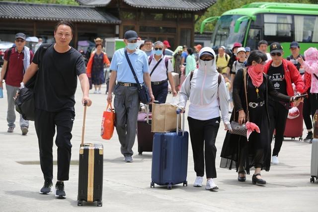正午时分,仙寓山景区游客服务中心大厅内人潮涌动,工作人员正在有序安排游客扫码登记,大厅外陆陆续续有大型中巴车驶入景区停车场,游客们下车收拾行李,随后换乘景交车进入景区。正在办理帮助游客办理手续的南京导游刘先生说:“我们这一次从南京来了47个游客。最近仙寓山这个康养游,在我们南京非常流行,大家非常喜欢这个地方。”