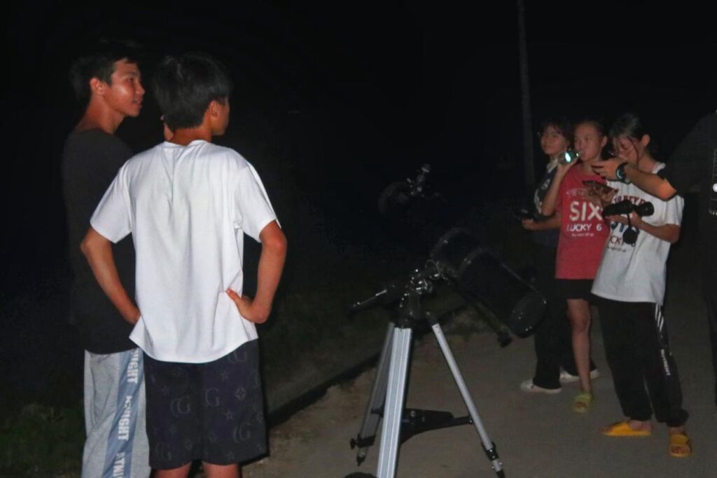 天文知识科普外,启明团队还带领同学们到适合进行观测的空旷地带架设天文望远镜等天文观测器材,进行了天文观测活动,给同学们更直接地接触星空的机会。在活动的过程中,我们观测了银河,土星以及各种星体。启明队成员们用指星笔向同学们介绍一些比较容易辨认的星体,教同学们一些基本的辨认星体的方法,同学们都热情高涨,活动的气氛十分热烈。在天文观测活动的过程中,同学们对观测到的各种现象都表现出极大的兴趣,不时地发出惊叹并十分积极地询问着各种有关天文的问题,如土星为什么会有环,星星为什么会闪等问题,而启明队的成员都对这些问题一一进行了回答。