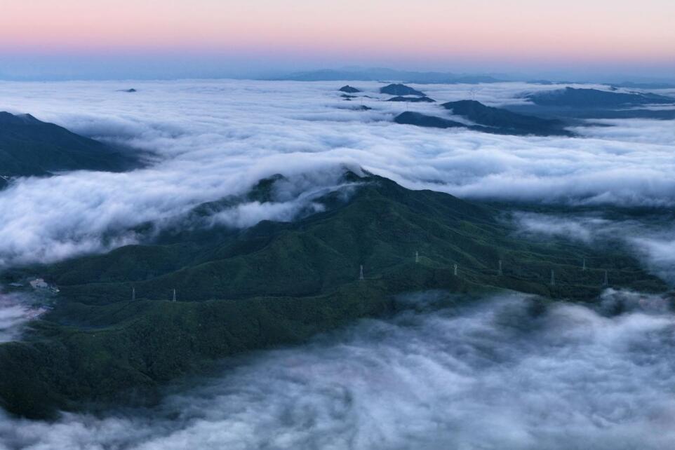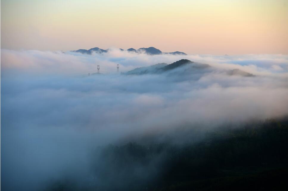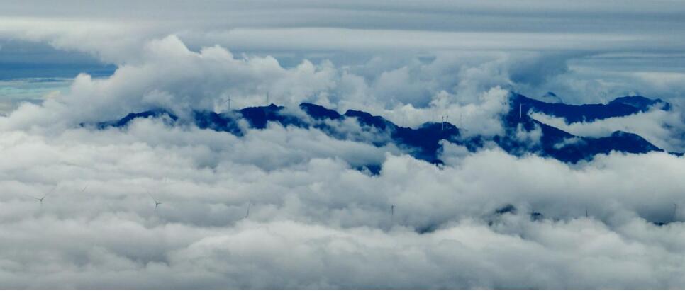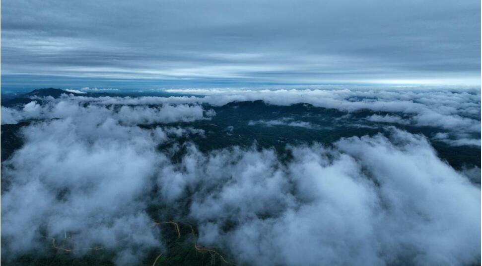 视线拉远,只见公路尽头有群山,山头被浓云笼罩,临近状元川景区,隐隐约约可看到那山顶玻璃桥的钢筋骨架,浓云林海之间有几座白色风车悠悠转动。微风拂面,空气中夹杂着雨后泥土的芬芳。这是人间的绝美风景,也是摄影记者此番要捕捉的镜头——状元川云海。