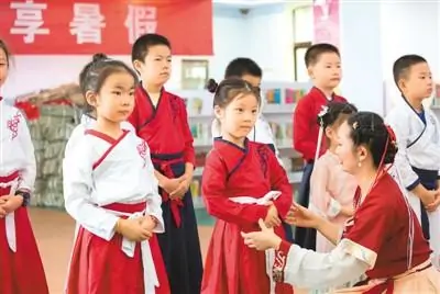 8月10日,在江苏省如皋市少儿图书馆内,老师在教小朋友学习汉服礼仪。徐 慧摄(人民视觉)
