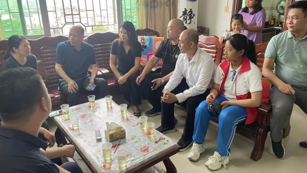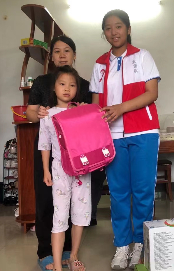 蓝建芳读六年级的女儿蓝紫淇(右一)也为参加了慰问,并为李雄读小学的小女儿李凯欣赠送了书包,献上小爱心。