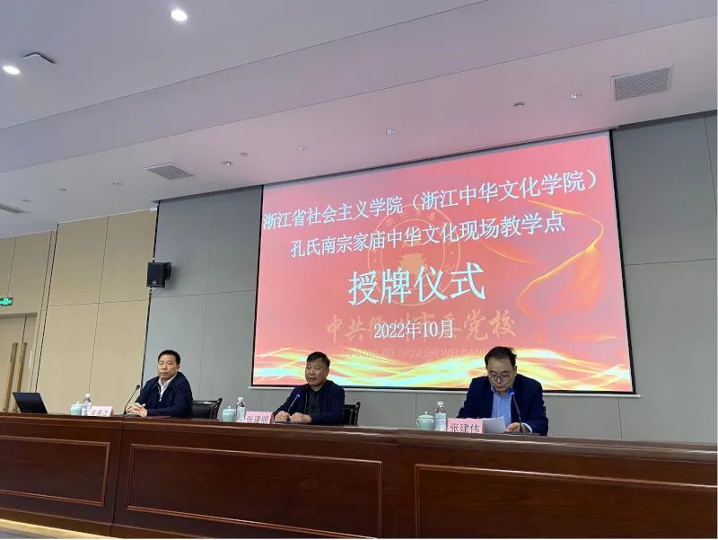 10月20日上午,浙江中华文化海外传播促进会衢州联络处授牌仪式在衢州市社会主义学院举行,同时举行的还有浙江省社会主义学院(浙江中华文化学院)中华文化现场教学点授牌仪式。浙江省社会主义学院(浙江中华文化学院)一级巡视员、浙江中华文化海外传播促进会第一常务副会长张建明分别向孔氏南宗家庙、衢州市社会主义学院授予“中华文化现场教学点”“浙江中华文化海外传播促进会联络处”牌匾。衢州市委党校常务副校长余尧正,衢州南孔文化发展中心主任盛雄生等出席授牌仪式。