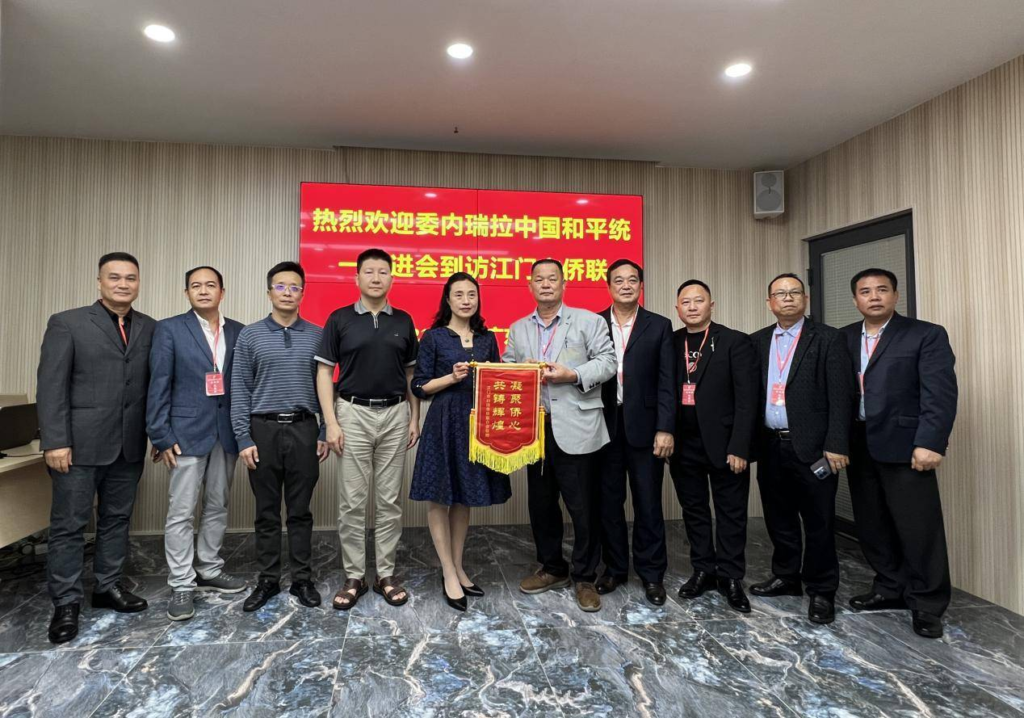 在江门,委内瑞拉中国和平统一促进会代表团一行受到江门市侨联党组书记、主席林春晖,副主席蓝敏雄、余泽权、郑文辉等热情接待。林春晖主席与委内瑞拉中国和平统一促进会代表团亲切合影,双方互赠纪念品。座谈会上,聂国常先生受广大侨胞委托,向江门侨务部门反映由于三年疫情影响,许多滞留国内的侨胞出现入境签证失效、逾期居留的情况,这些侨胞正面临出入境部门罚没高额罚款的困境,聂会长希望大陆出入境部门考虑到疫情的特殊不可控因素,从助侨便侨的角度出发,尽可能减轻侨胞经济负担,令国家爱护侨胞、维护侨益的利好政策实事求是落到实处。江门市侨联领导认真听取聂会长有关意见建议,并一一详细记录。江门市侨联领导向委内瑞拉中国和平统一促进会代表团一行详细介绍了江门市近年大力开展港澳融合、侨都赋能等发展战略建设推进情况,期望广大海外侨胞多回来家乡走一走、看一看,更欢迎广大华商前来江门五邑投资创业,共建美丽侨乡。