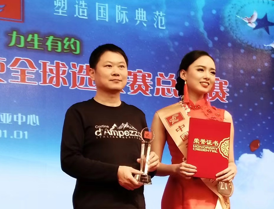 上图:国际媒体组织干事长、中国形象大使全球选拔赛主席陈学刚先生爲全球总冠军高诗琪颁奖