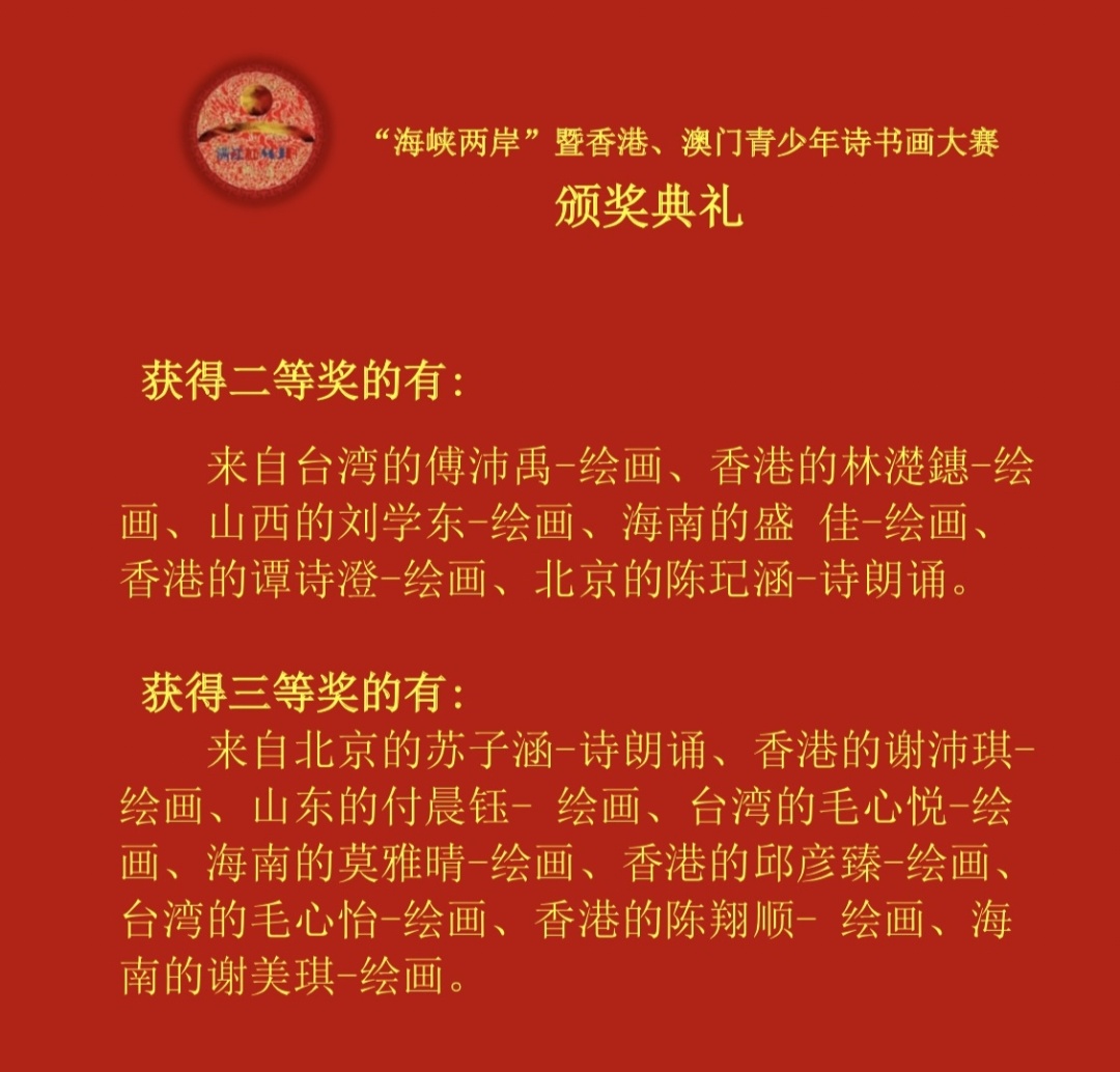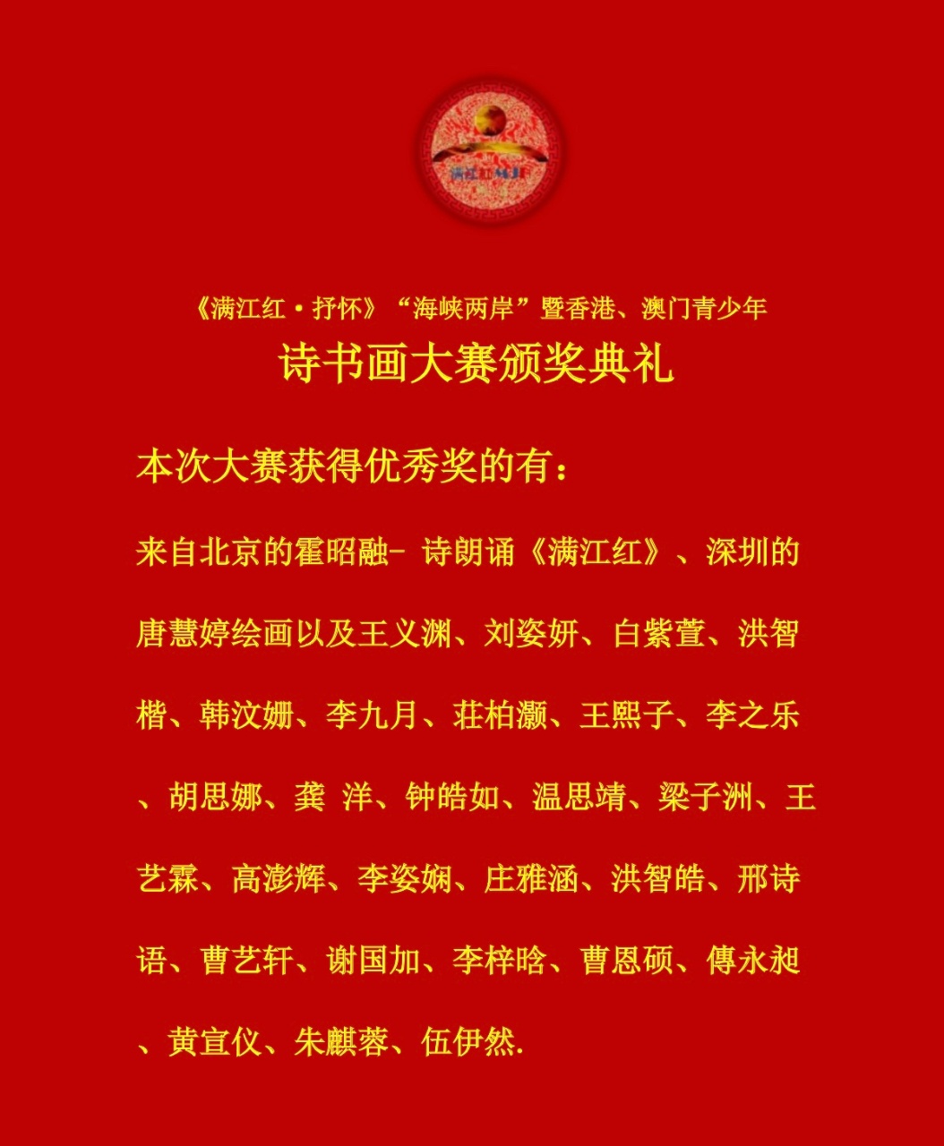 金秋十月,一个风和日丽的日子10月18日,我们欣喜的迎来了备受各界关注的《满江红· 抒怀》“海峡两岸”暨香港、澳门青少年诗书画大赛的线上颁奖典礼!