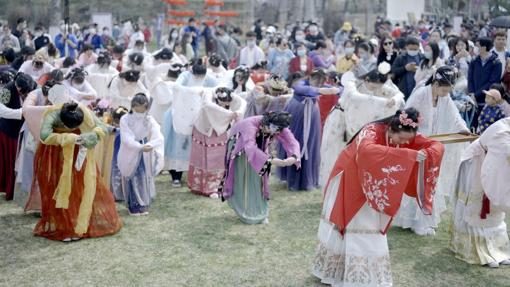 古人眼中,祭祀乃严肃之大事,在花朝节时,摆好香炉、烛台、香果等祭品后,赞者便端肃入场,向祭台行揖礼,再宣布祭花神仪式开始。在4月5日的祭祀大典中,本次活动入选的十二花神们与汉服同袍们共同参与,一起祭祀庆帝神君,伴随着庄重的音乐声,在迎神、焚香、沃盥礼、烧祝文、跪拜礼、食福果等流程过后,人们共同祈愿庆帝神君护佑我华夏儿女,保佑我盛世中国。