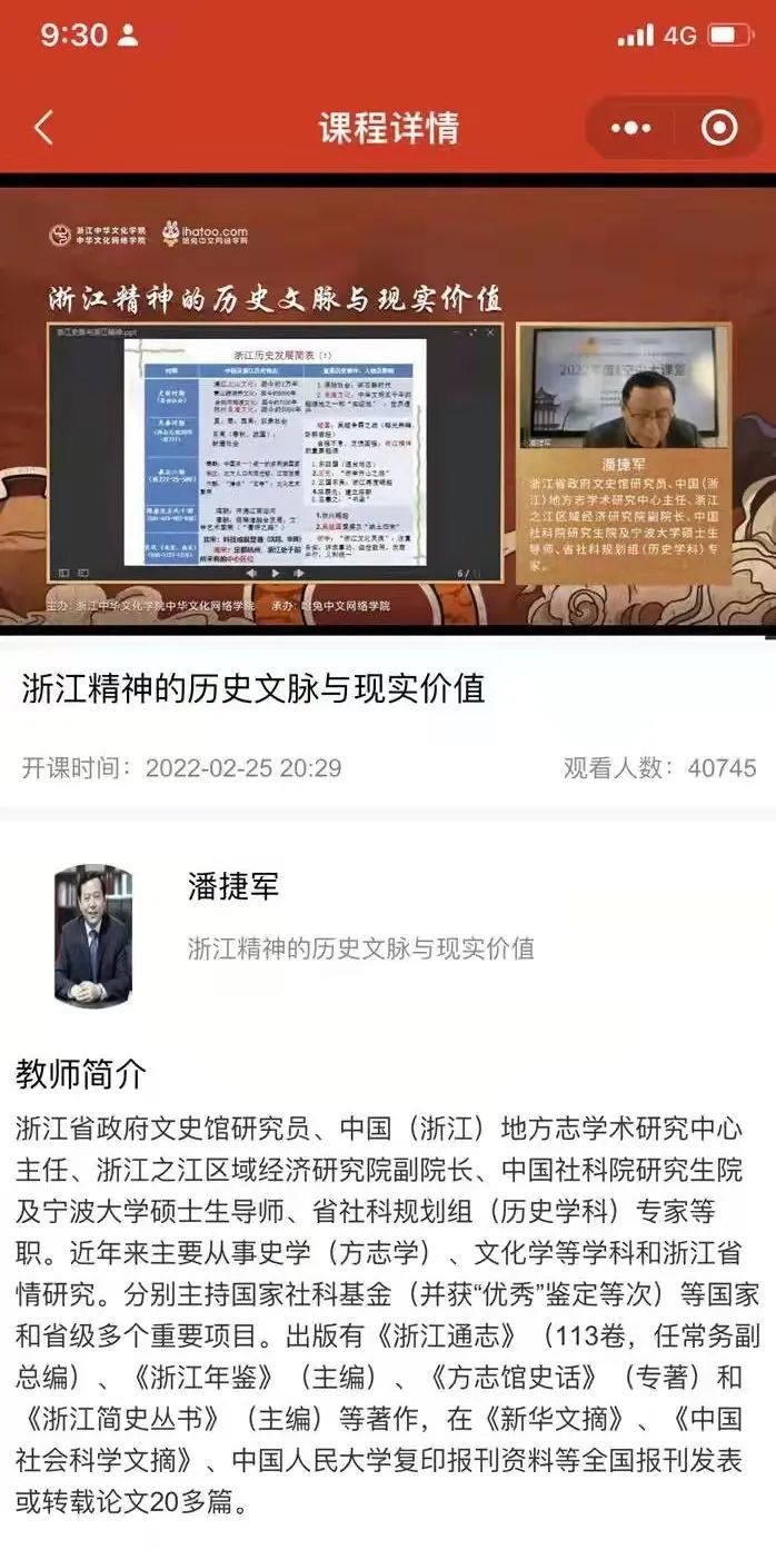 本期讲座的主题是“浙江精神的浙江史脉与现实价值”,由浙江省政府文史馆研究员、中国(浙江)地方志学术研究中心主任潘捷军主讲。他从浙江历史发展过程、浙江历史发展过程中形成的浙江精神两大版块进行讲解。在介绍浙江历史发展过程时,他结合中国的历史起源,对浙江历史的发展过程、主要史迹(人物)与特点进行介绍。在对浙江历史发展过程中形成的浙江精神进行介绍时,他以时任浙江省委书记的习近平同志在2006年对浙江精神的定位“求真务实、诚信和谐、开放图强”为主线,从“遵循规律、尊崇科学的执着‘求真’是浙江始终不渝的真理追求””注重现实、讲求实效的勤勉‘务实’是浙江世代传承的风尚秉赋”“诚实立身、守正不渝的坚守‘诚信’是浙江先人躬身践行的行为准则””天人合一、和美与共的尊崇‘和谐’是浙江社会维系发展的基本共识””海纳百川、兼容并蓄的追求‘开放’是浙江人民梦寐以求的历史夙愿”“励志奋进、自强不息的立志‘图强’是浙江历代发展的最强主旋律”六个方面进行深入浅出的讲解。