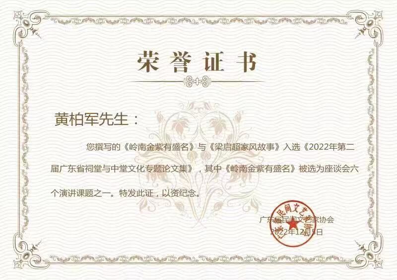 江门市民俗学者黄柏军撰写的两篇民间民俗研究论文《岭南金紫有盛名》以及《梁启超家风故事》均入选《2023年广东省第二届中堂与祠堂文化专题论文集》,广东省民间文艺家协会向作者颁发入选证书;其中,论文《梁启超家风故事》还被活动主办方列为6篇优秀论文,作者黄柏军应邀在会上发表主题演讲。