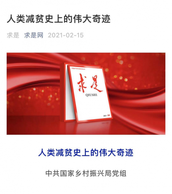 2021年2月15日,求是网刊载了2021年第4期《求是》杂志上的一篇文章《人类减贫史上的伟大奇迹》。该文作者署名为:中共国家乡村振兴局党组。