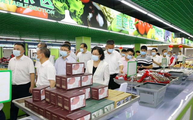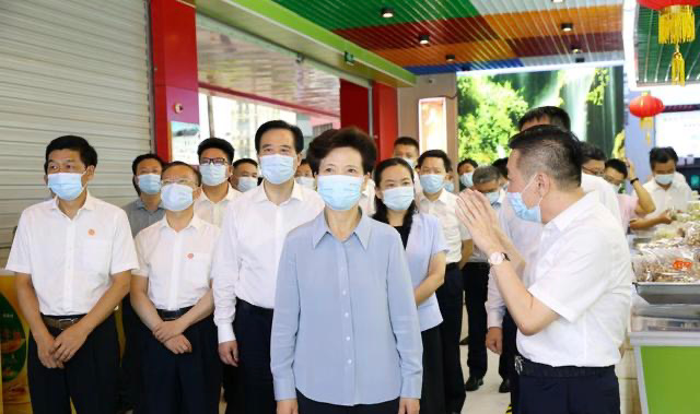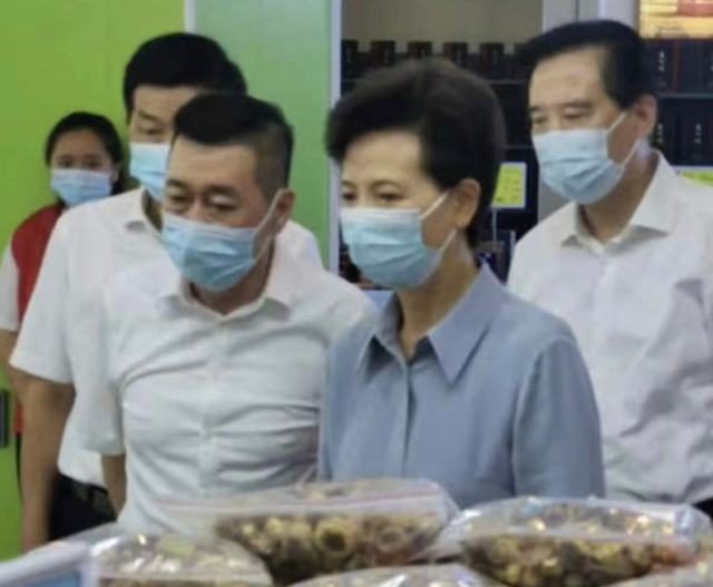 贵州省委书记、省人大常委会主任谌贻琴在壹窝峰集团董事长林东波陪同下视察惠州市粤黔东西部协作黔西南州农特产品交易市场。