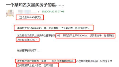就在近日,有网友发文爆料,称自己有某个女明星买房子的瓜,同时还表示这件事的真实程度高达99.99%。该网友表示,事情发生的时间在2018年年底,当时某地产公司在上海开了豪宅盘,一套房子价值在5000万+。这位女星直接对房产董事长表示“我现在手上只有3000万,想买套房子,你看我能为你做些什么吗?”