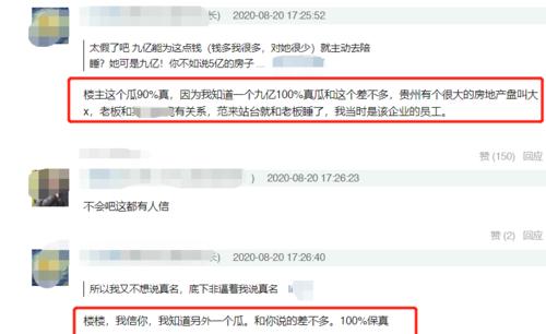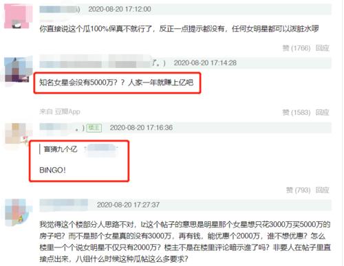 这位网友爆料的范围太大,只说了是“女明星”其他任何信息都没有透露,因此遭到网友们一致吐槽。还有网友认为,如果是知名女星,不会连5000万都没有,事情太假了。但这位爆料者不久之后也提供了一些信息,比如名字是“ABB”格式的,甚至在某网友说出“盲猜九亿”的时候,为对方评论“bingo(猜对了)”。