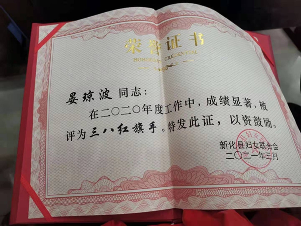 中国记录通讯社娄底3月10日讯(记者 阳家友 卿跃飞)3月8日,在新化县妇联组织召开的表彰大会上,上渡街道社区卫生服务中心晏琼波被县妇联授予“三.八红旗手”荣誉称号。听到这个消息,上渡街道兴岭村的群众都说:“小晏这个妹子,腿勤手勤,没多话,爱帮忙,县里给她评‘三.八’红旗手,意料中的事。”